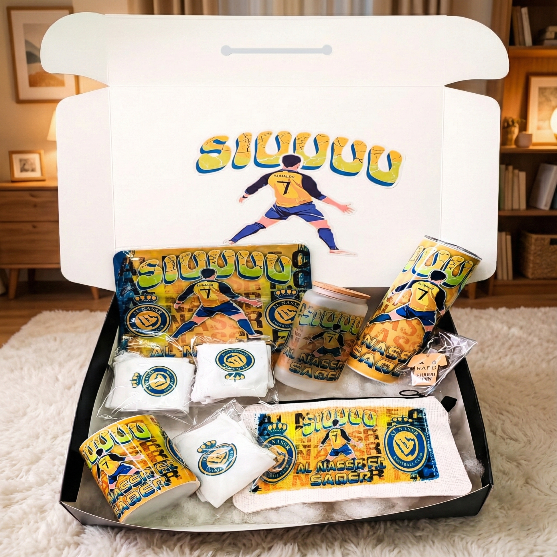 Al Nassr CR7 Fan Box – Custom Name | Includes Mouse Pad, Pouch, Socks & Drinkware Set & More