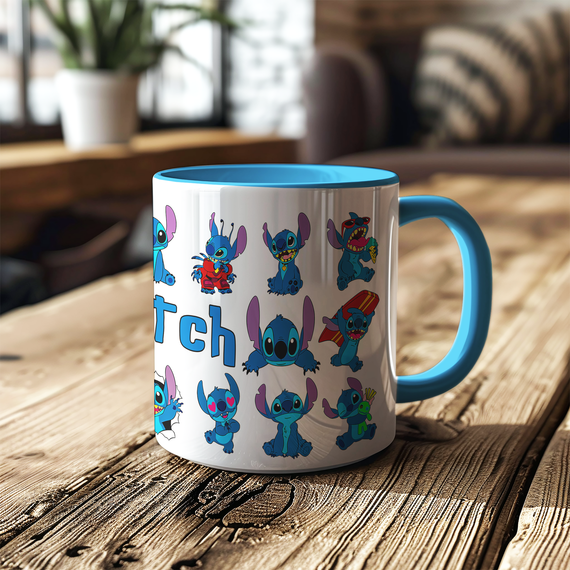 Stitch Character Collage Ceramic Mug with Blue Handle & Rim – Custom Name | Vibrant & Comfortable