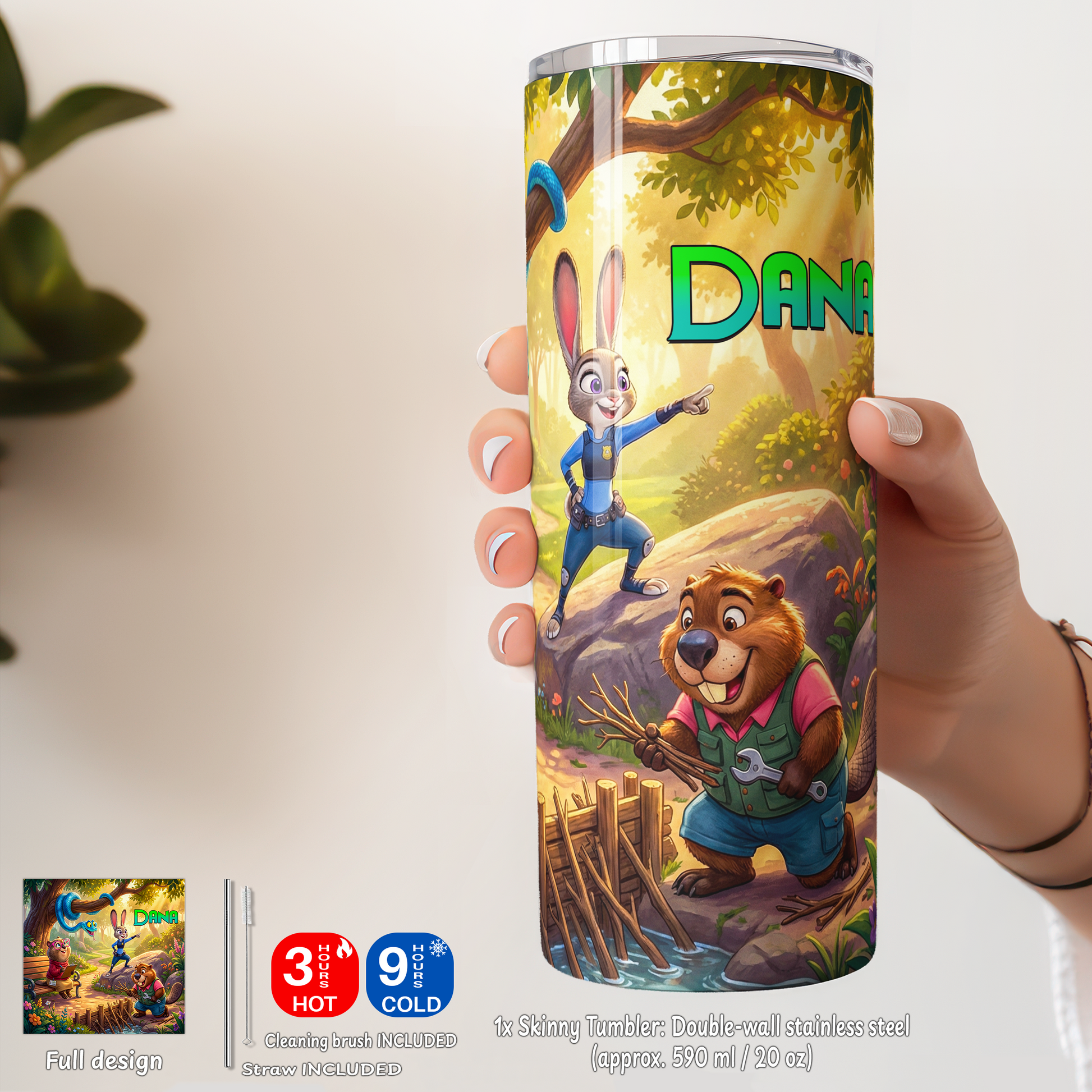 🥤 Skinny Tumbler: Double-wall stainless steel (approx. 590 ml / 20 oz) that keeps drinks hot for 3 hours/cold for 9 hours.
